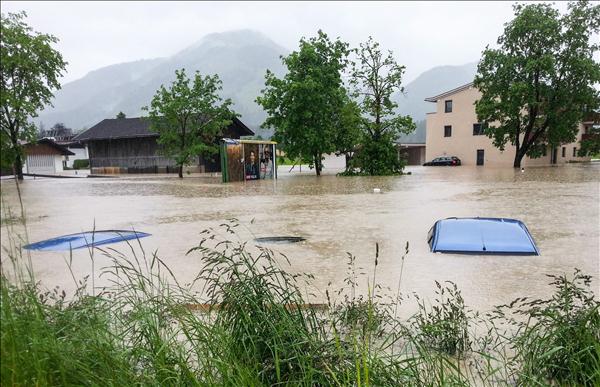 Áradás Ausztriában (MTI) - Autók sodródnak az árban a német határ közelében az ausztriai Tirol tartományban lévő Kössenben 2013. június 2-án