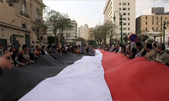 Kormányellenes tüntetők hatalmas egyiptomi zászlót feszítenek ki a kairói parlament előtt 2011. február 9-én - Forrás: MTI