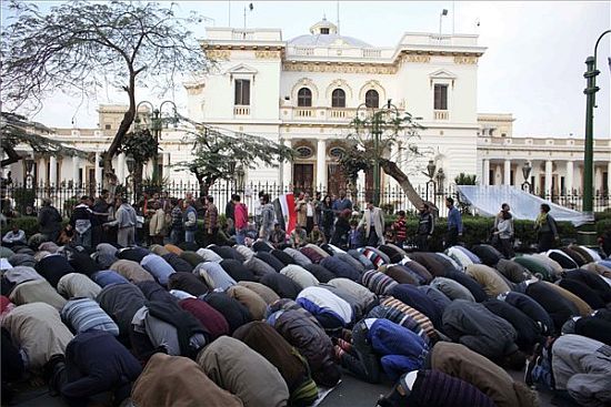 Kormányellenes tüntetők imádkoznak a kairói parlament előtt 2011. február 9-én - Forrás: MT - Forrás: MTI