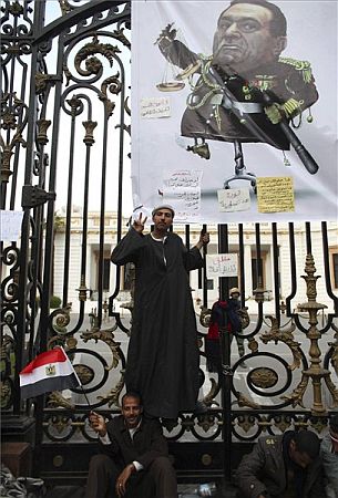 Kormányellenes tüntető a kairói parlament kapujára kapaszkodva fényképezkedik, fölötte Hoszni Mubarak egyiptomi elnök karikatúrája látható 2011. február 9-én.