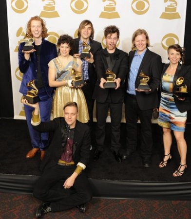 Az Arcade Fire kanadai indiezenekar tagjai a gramofonszobrocskájukat fogják - Fotó: MTI