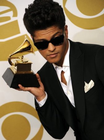 Bruno Mars amerikai énekes-dalszerző a gramofonszobrocskáját fogja - Fotó: MTI