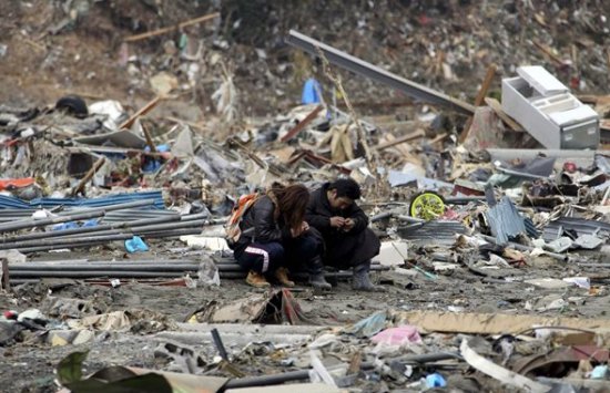 Két alkalmazott egykori munkahelyének romjai között ül a Mijagi prefektúrabeli Minamiszanrikuban - Fotó: MTI