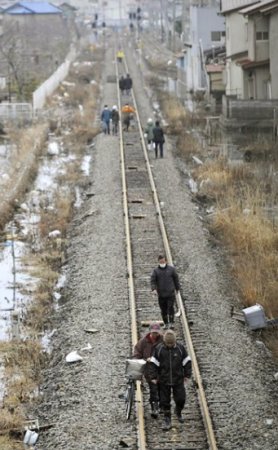 Az utak járhatatlansága miatt vasúti vágányon mennek az emberek a Mijagi prefektúrabeli Isinomakiban - Fotó: MTI