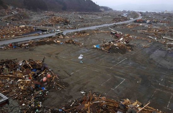 Esernyős túlélők mennek a szökőár elpusztította Minamiszanriku városában - Fotó: MTI
