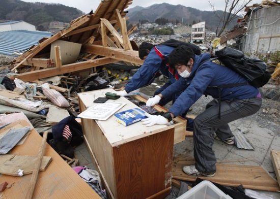 SIDA Ricsi (j) és az öccse, Kento egy fiókot próbál kinyitni szökőár által elpusztított házának romjai között, az Ivate prefektúrabeli Ofunatóban - Fotó: MTI