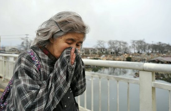 A kezébe temeti arcát egy nő, aki megtudta, hogy otthonát elvitte a szökőár a Mijagi prefektúrabeli Keszennumában - Fotó: MTI