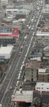 Hosszú sorban állnak autók egy benzinkút előtt a Tokiótól északra fekvő Ageóban - Fotó: MTI