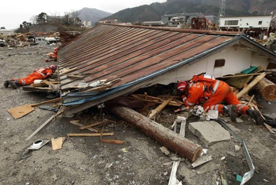 Földön heverő háztető alatt keresnek túlélőket egy brit mentőcsoport tagjai az Ivate prefektúrabeli Ofunatóban - Fotó: MTI