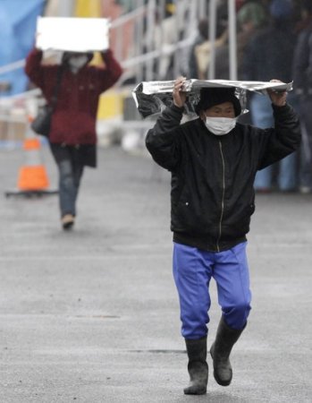 Hőtakarót visz egy sugármérésen átesett férfi a Fukusima prefektúrabeli Korijamában - Fotó: MTI