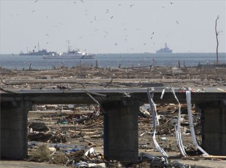 Szökőár elpusztította terület fölött szállnak sirályok az Ivate prefektúrabeli Rikuaentakatában (fotó: MTI)