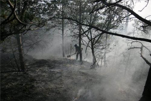 A települések polgármesterei önkénteseket és a lakosságot riasztották a tűz oltásához, az erdő mellett élőket hátsó udvaraik locsolására kérik. (fotó: MTI)