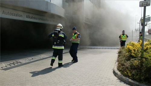 Rendőrök és tűzoltók dolgoznak egy Váci úti autókereskedés előtt, amelyből sűrű füst ömlik ki (fotó: MTI)