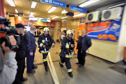 Tűzoltók dolgoznak a BKV Árpád hídi megállójánál, ahol kigyulladt egy metrókocsi az alagútban.(fotó: MTI))