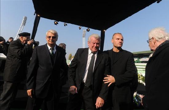 Szűcs Lajos egykori csapattárs (k), miután lerótta kegyeletét Albert Flórián, az FTC legendás futballistája ravatalánál - Fotó: MTI