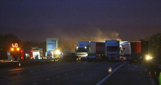 Összeütközött járművek láthatók a délnyugat-angliai M5-ös autópályán, Taunton közelében - Fotó: MTI