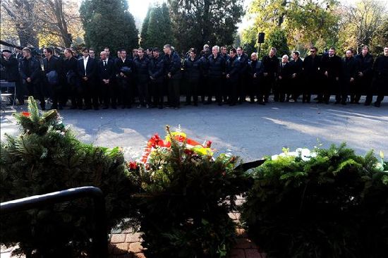 Az FTC labdarúgó csapata áll a Ferencvárosi Torna Club legendás futballistája, Albert Flórián ravatalánál, az Óbudai temetőben - Fotó: MTI