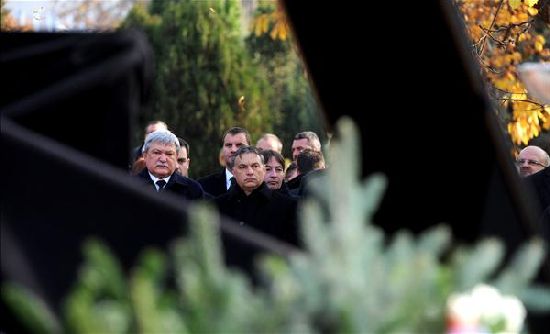 Gyászolók, köztük Csányi Sándor, az MLSZ-elnöke (b), Czene Attila, a Nefmi sportért felelős államtitkára (b2), Orbán Viktor miniszterelnök (b3) és Szabó László, az MTVA kommunikációs igazgatója (b4)