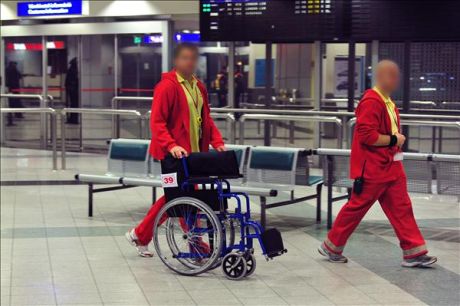 Mentők tolnak egy kerekesszéket a Budapest Liszt Ferenc Nemzetközi Repülőtéren (MTI)