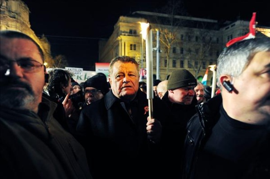 Békemenet: Széles Gábor nagyvállalkozó (középen) áll fáklyával kezében a résztvevők között a Békemenet Magyarországért címmel meghirdetett kormánypárti demonstráción, az Országház előtt - 2012.01.21.